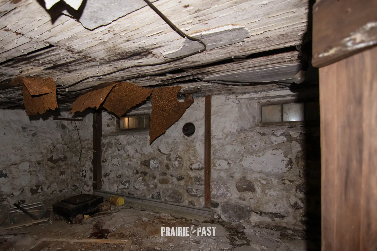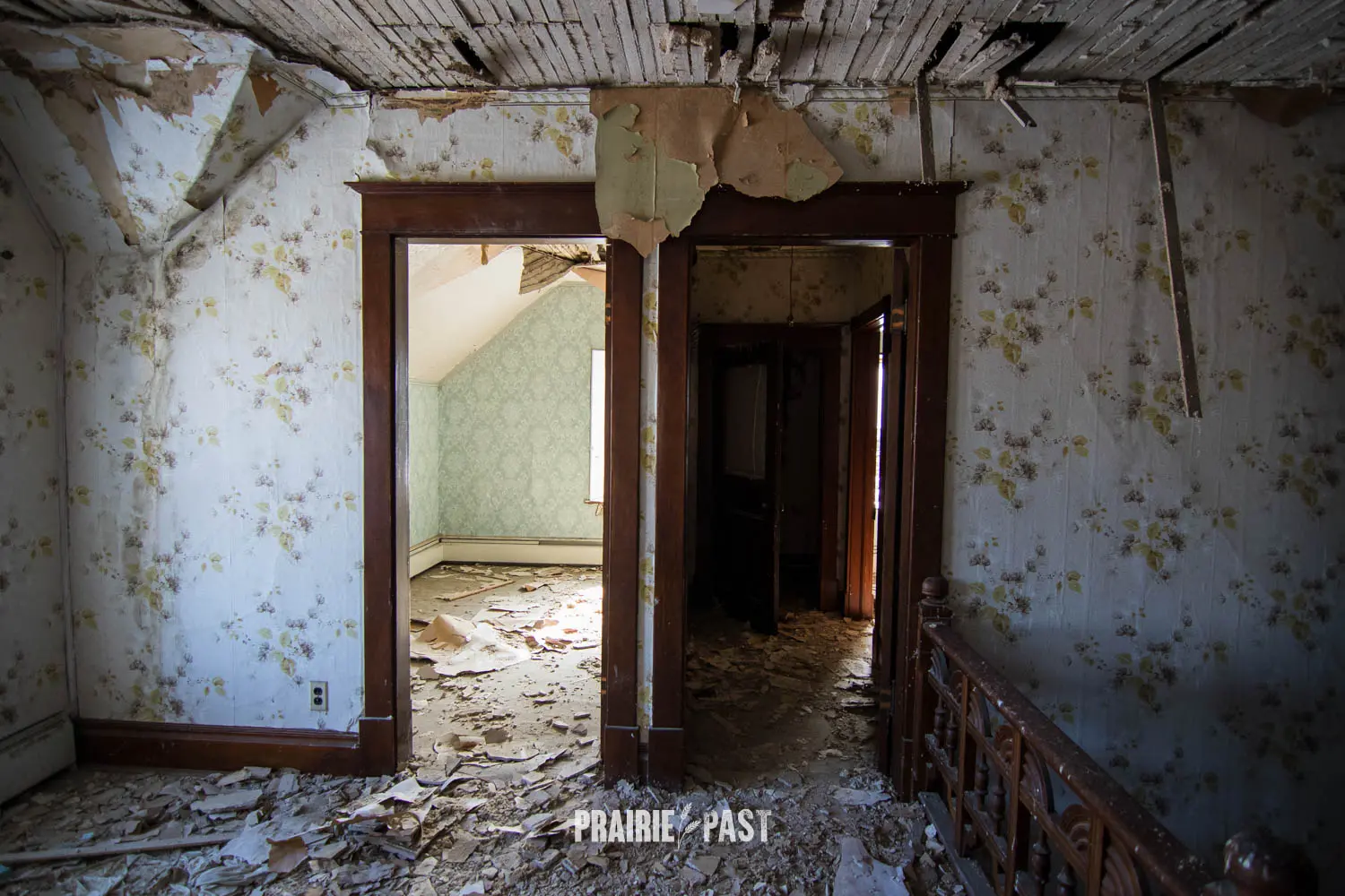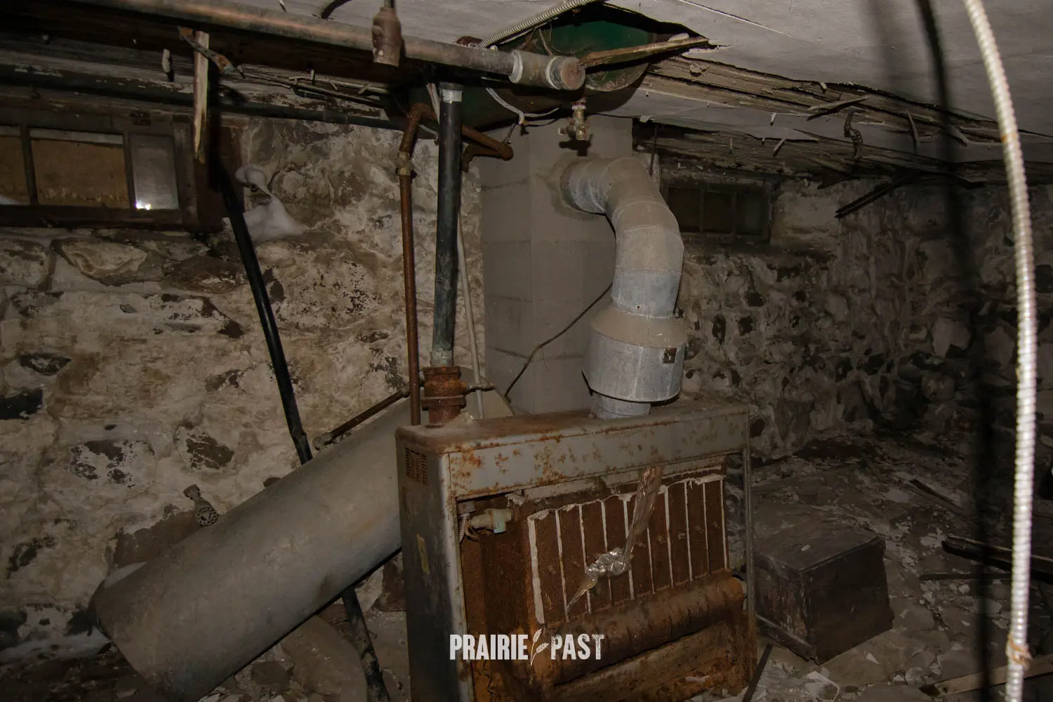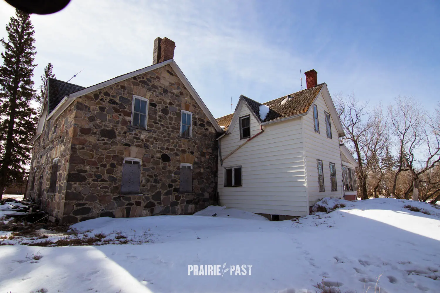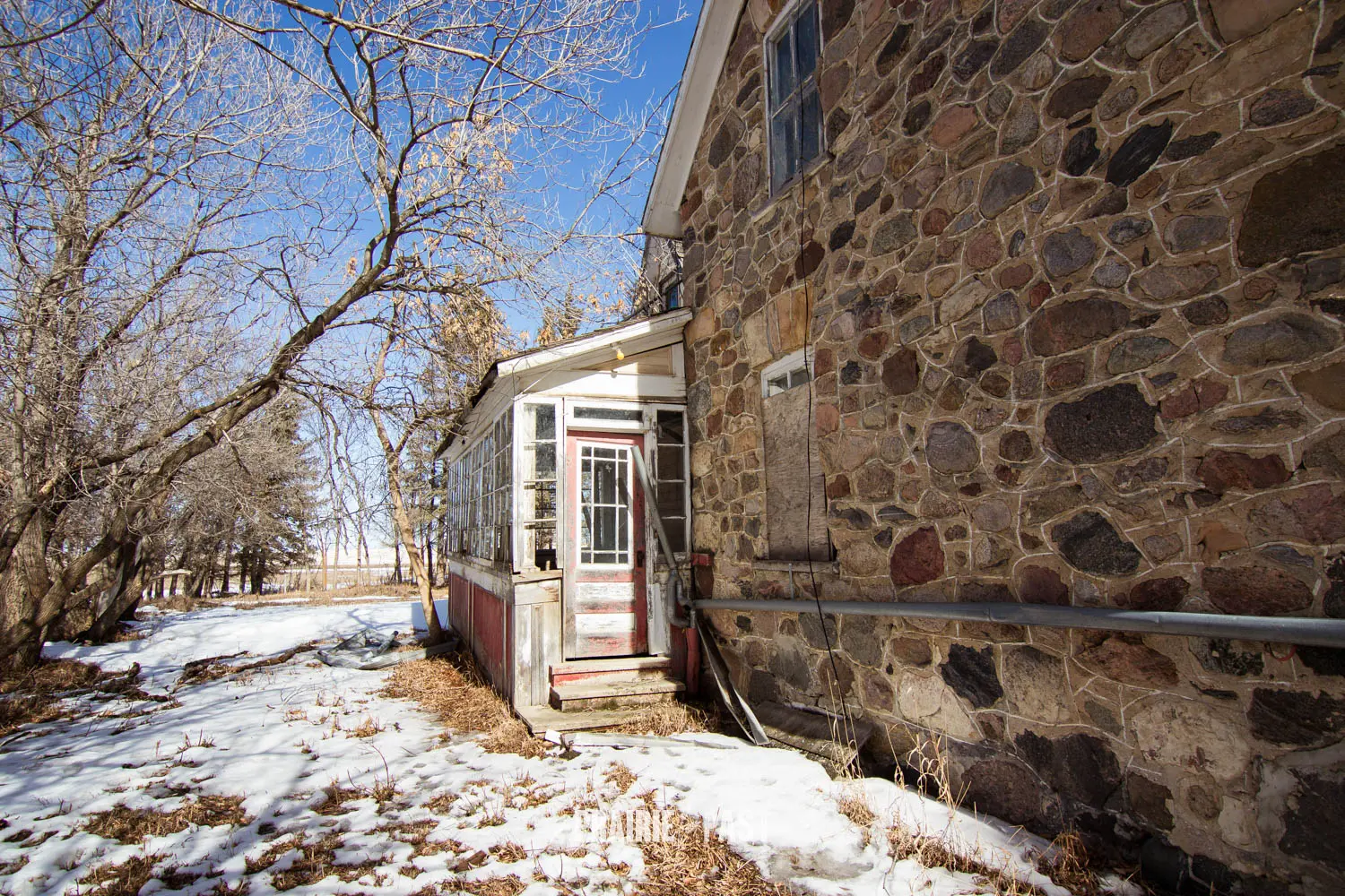 This house is set off the road a bit and is fenced and we did not want to trespass. After years of passing by when we were in the area, we made a connection with another explorer and got permission to access the site. It was for sale and went to visit with the new potential owners. When we reached the property it had an original small house and a large house which was a stone house with a large addition on the side/back. We did a full walkthrough and were able to come back one more time after the people we had originally gone with purchased the house.