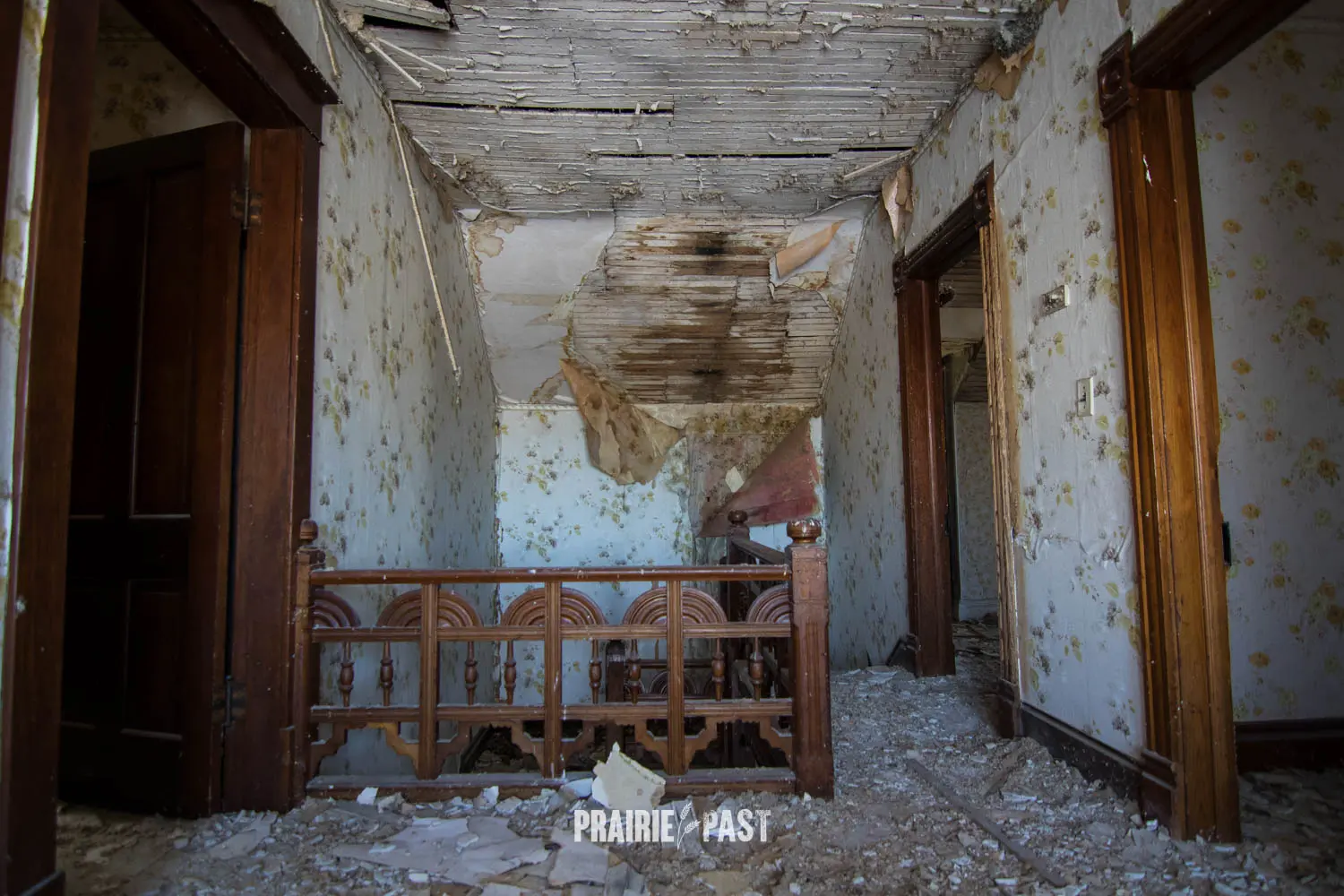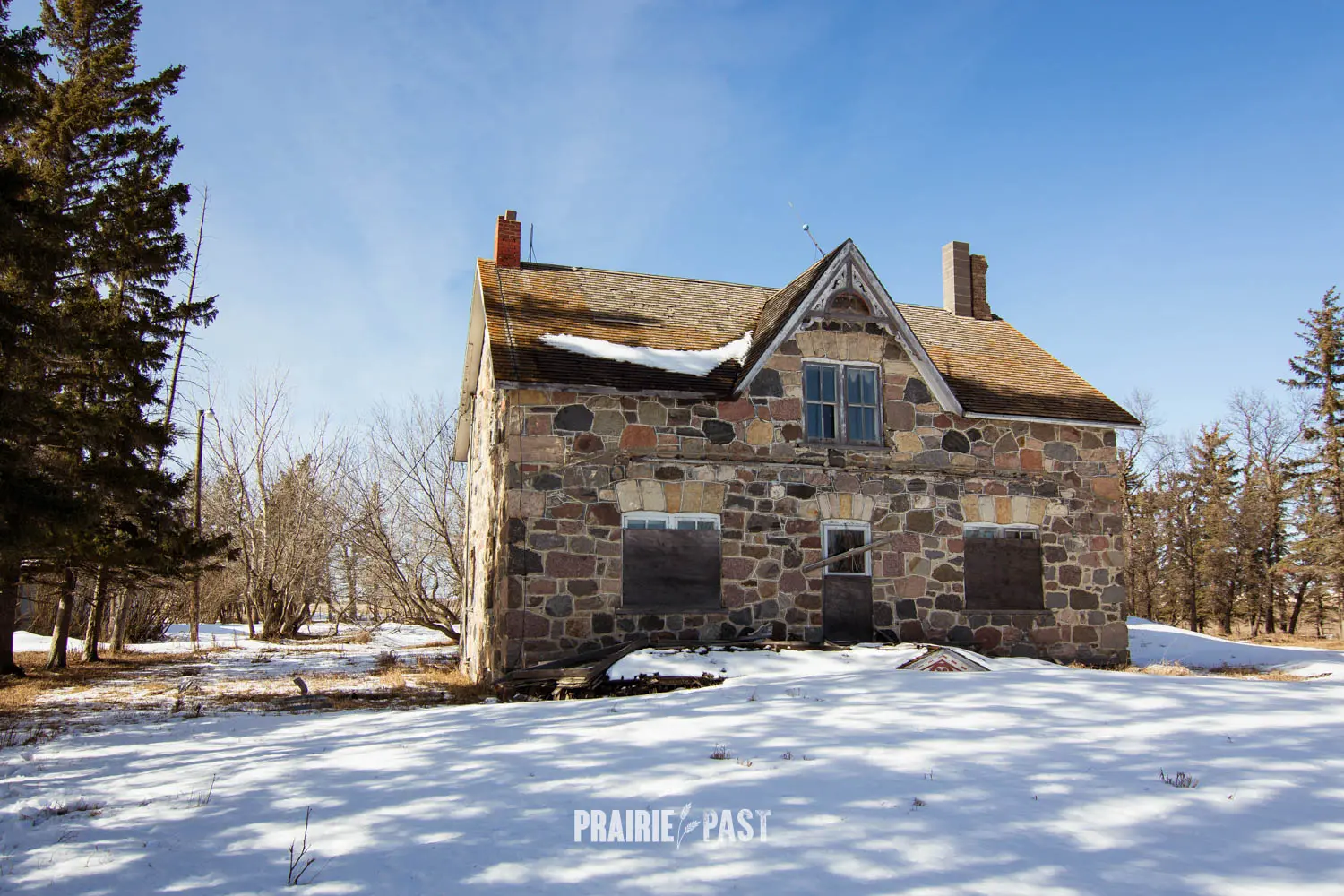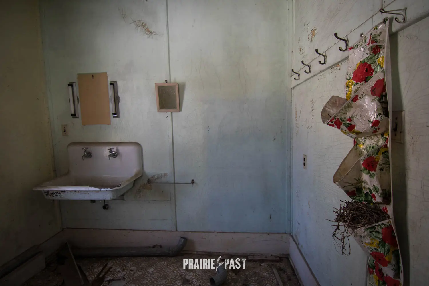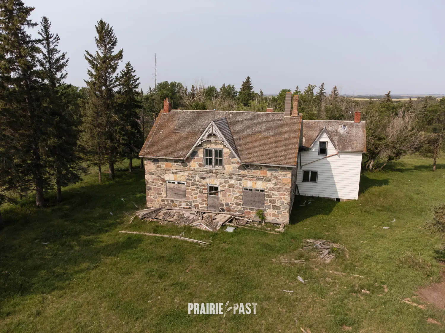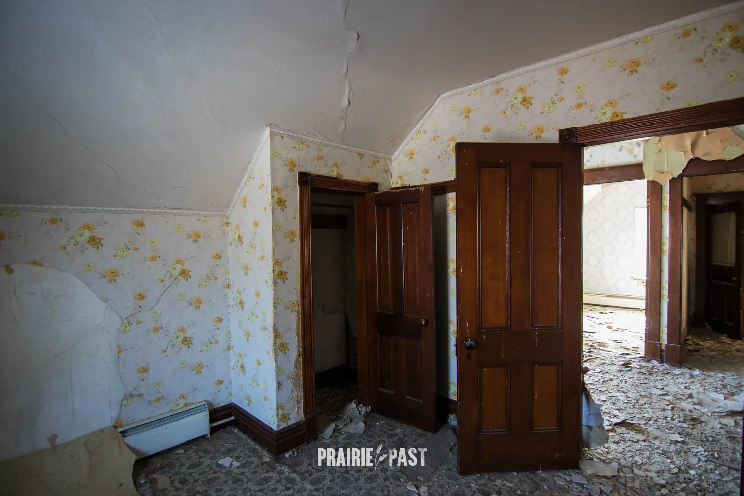 This house is set off the road a bit and is fenced and we did not want to trespass. After years of passing by when we were in the area, we made a connection with another explorer and got permission to access the site. It was for sale and went to visit with the new potential owners. When we reached the property it had an original small house and a large house which was a stone house with a large addition on the side/back. We did a full walkthrough and were able to come back one more time after the people we had originally gone with purchased the house.