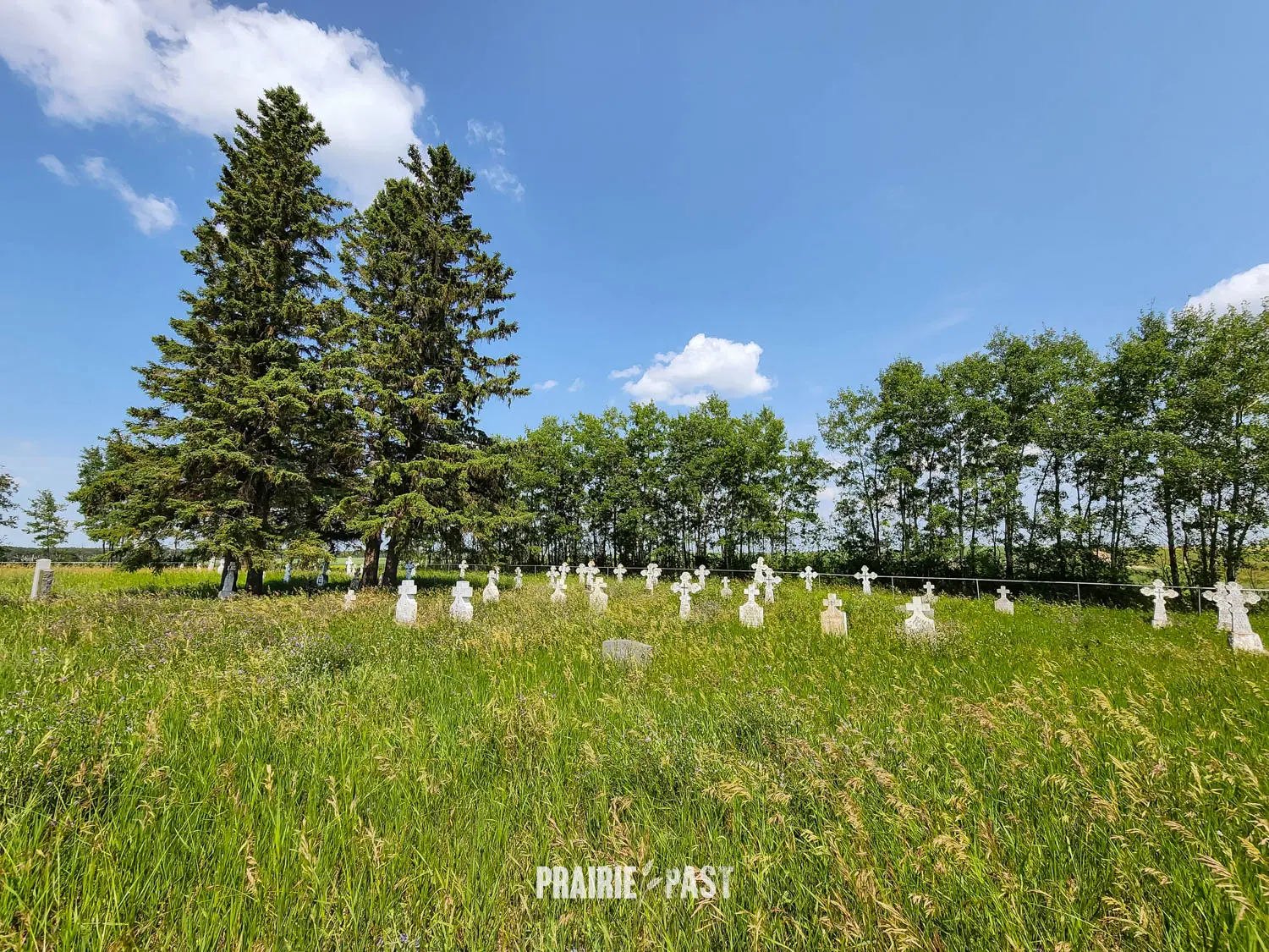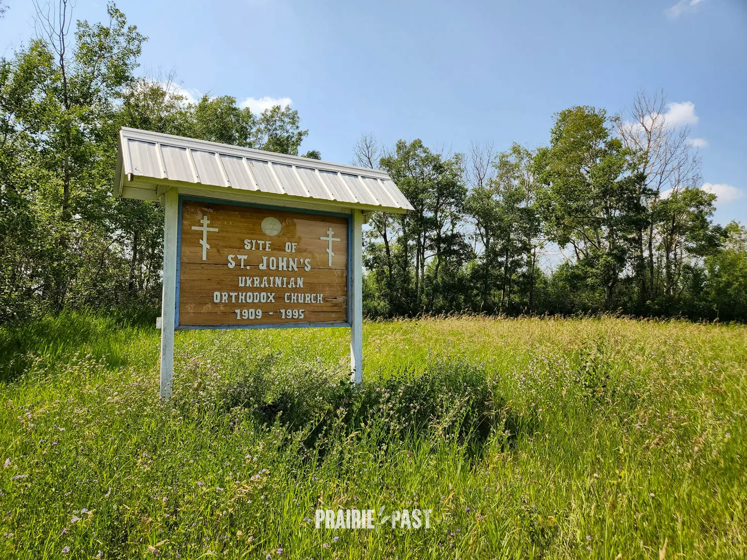 St. John's Ukrainian Orthodox church, located near Rhein, Saskatchewan, is a part of the Ukrainian heritage in the area. The church stood from 1909 to 1995 and looks very similar to St. Elias. The church has been demolished, but the cemetery remains with a sign to commemorate the church. Pioneer names in the cemetery include Achtemichuk, Gnyp, Hrenyk and Kereluk.