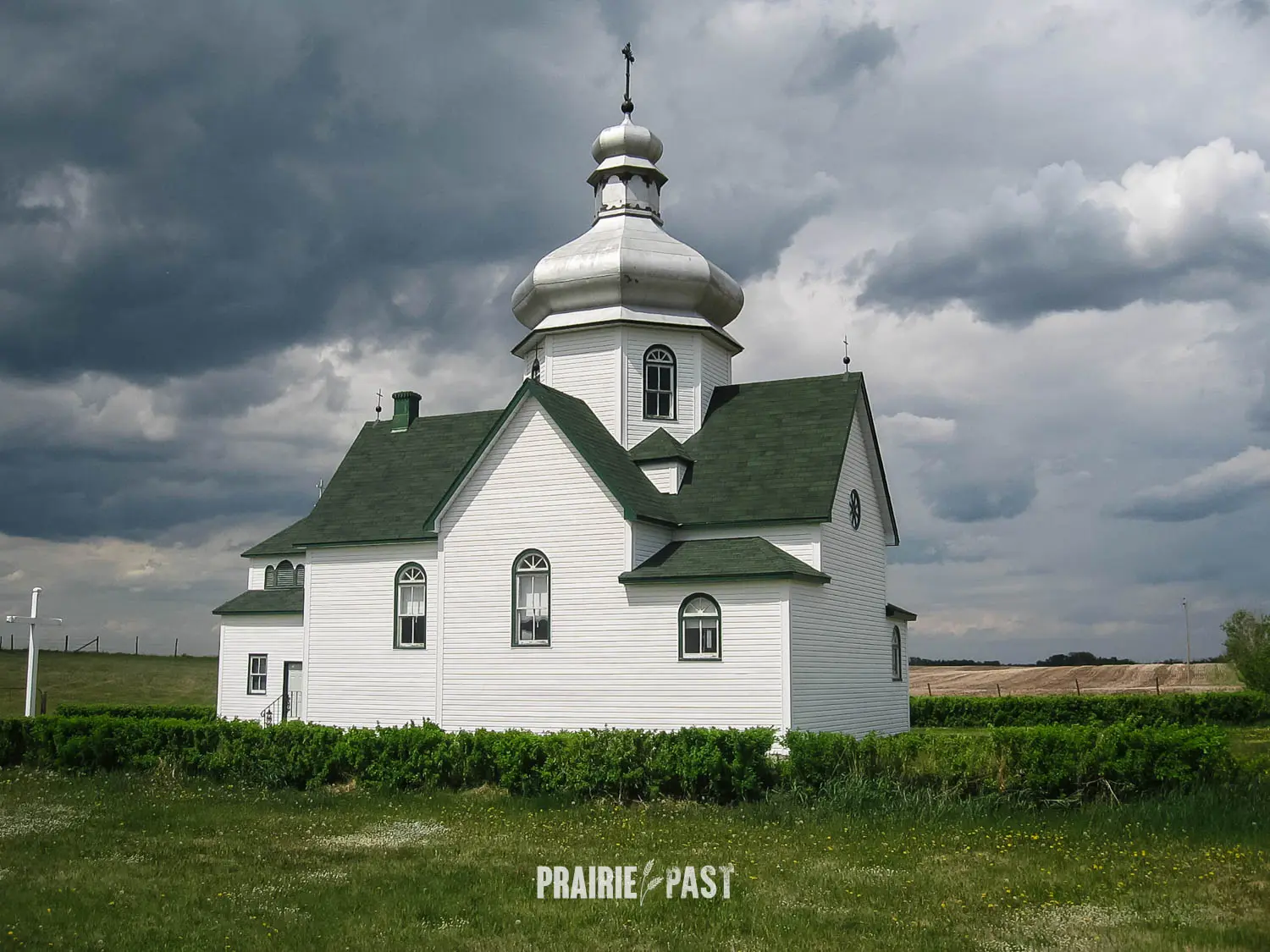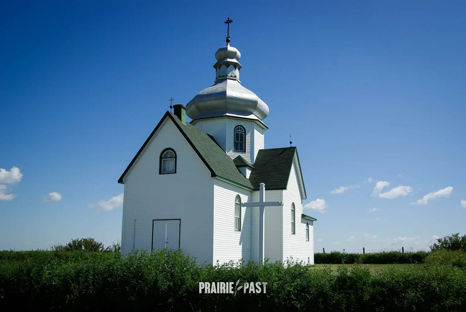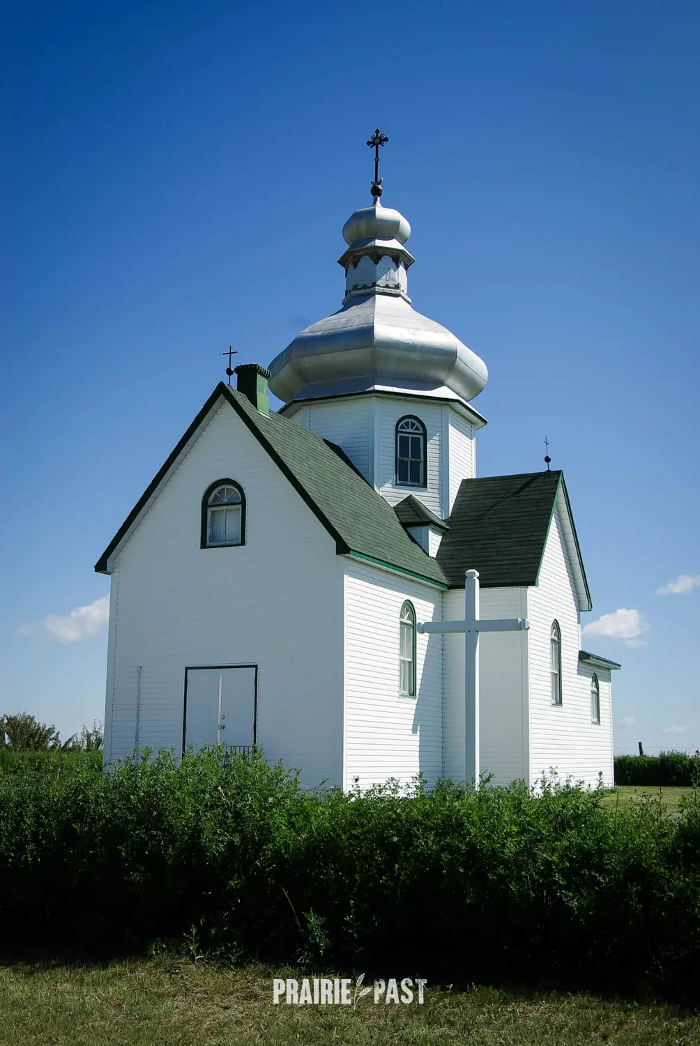 The current church is a modest cruciform structure, and is crowned by a central sheet metal dome that once gleamed in a copper-bronze tone. Its shingled roof and light-painted wood siding give the building a clean, understated appearance that blends with the prairie surroundings. The west-facing entrance opens directly into the nave, while the eastern wing houses a slightly elevated sanctuary flanked by sacristies. Inside, the space is both simple and expressive, with a high central dome illuminated by four windows and vaulted ceilings extending into each arm of the cross-shaped design.