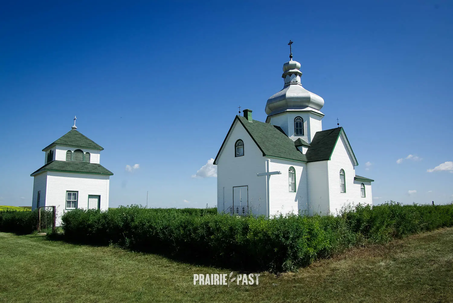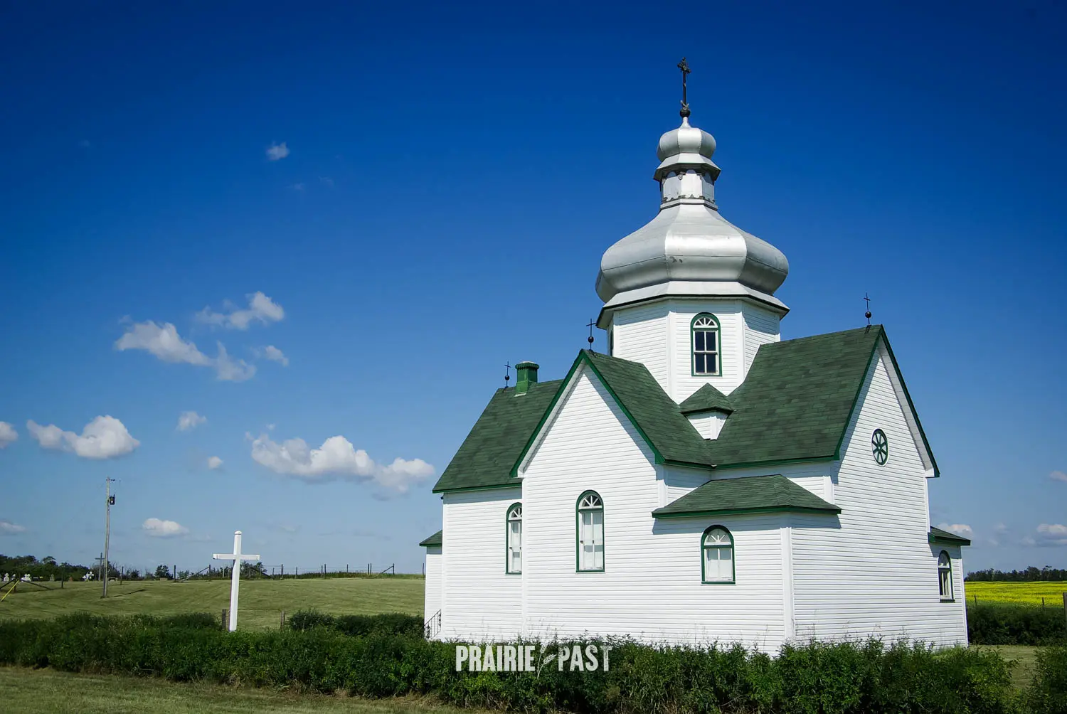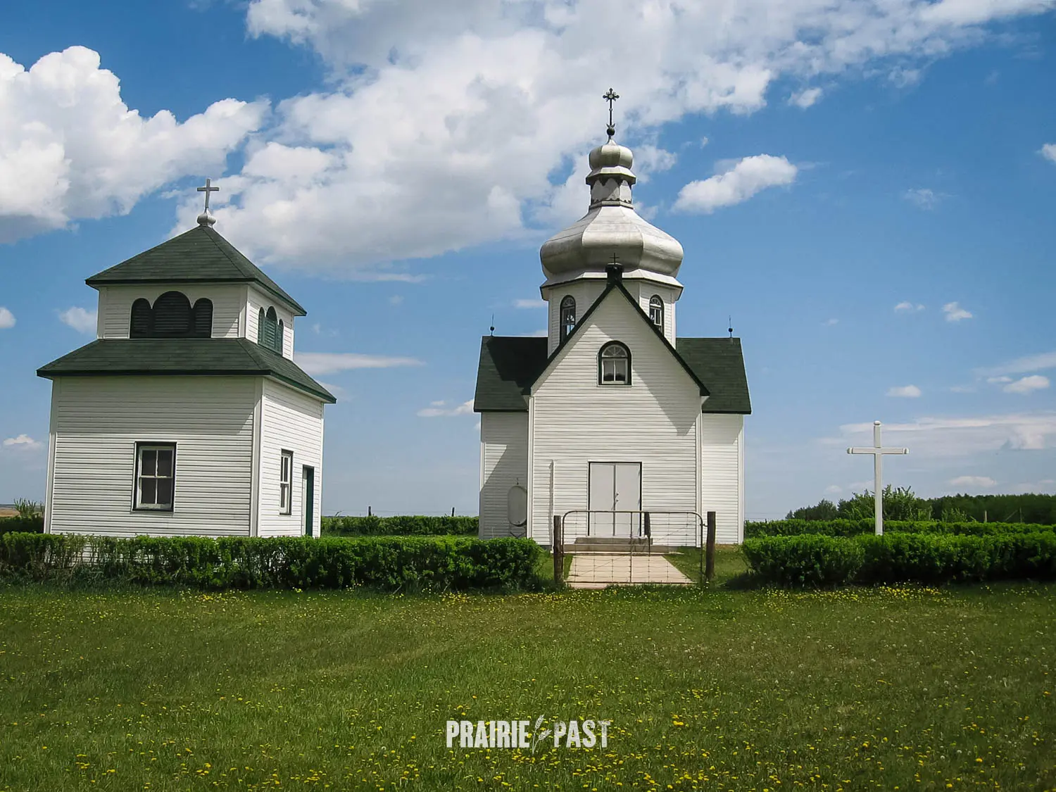 The current church is a modest cruciform structure, and is crowned by a central sheet metal dome that once gleamed in a copper-bronze tone. Its shingled roof and light-painted wood siding give the building a clean, understated appearance that blends with the prairie surroundings. The west-facing entrance opens directly into the nave, while the eastern wing houses a slightly elevated sanctuary flanked by sacristies. Inside, the space is both simple and expressive, with a high central dome illuminated by four windows and vaulted ceilings extending into each arm of the cross-shaped design.