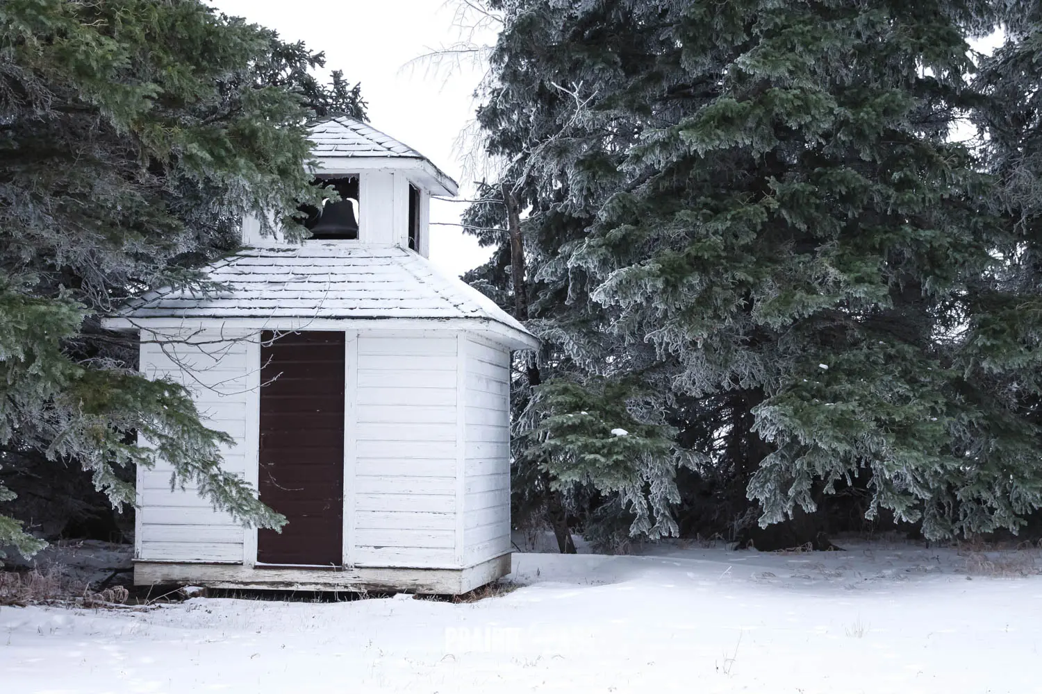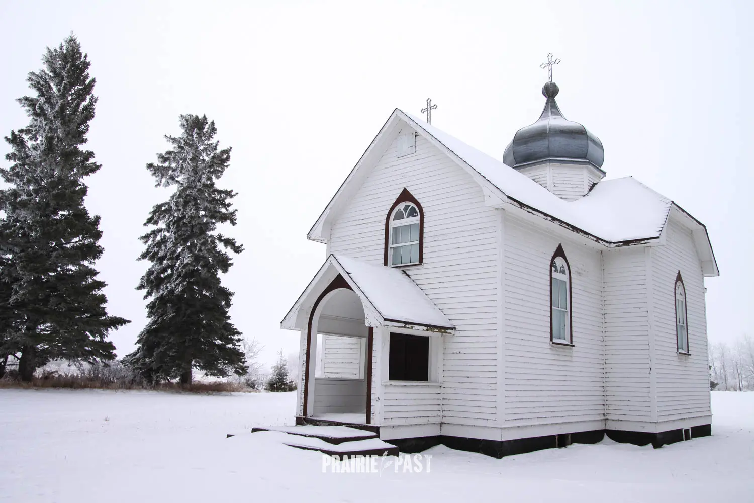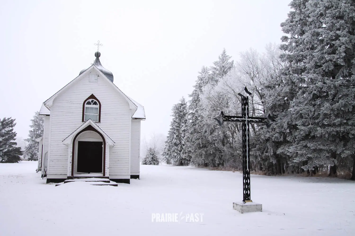 The structure itself reflects traditional Ukrainian Catholic architectural influences adapted to rural prairie life. Constructed of wood in a cruciform design, the church features a central blind cupola rising above a shingled gable roof. Its painted wood siding and arched windows lend a simple yet elegant character, while the east-facing entrance leads into a modest nave with seating for about 50 parishioners. Inside, the church is thoughtfully arranged with a main altar in the sanctuary and two side altars dedicated to the Holy Mother of God and Christ Who Loves Mankind.